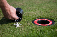 Nedsænket i græsset, så der kan klippes henover den. Med beholder til tees, som let løftes op for tømning.