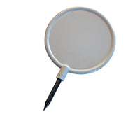 Skiveformet rund tee markering i hvid slagfast plast. 12 cm i diameter med 8 cm alu spids.